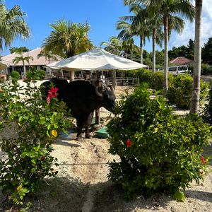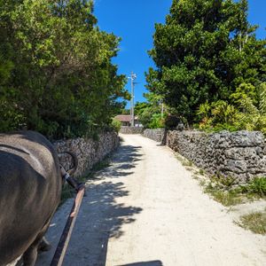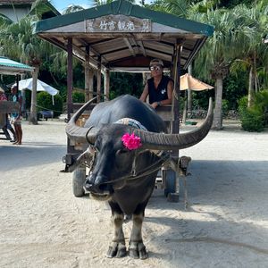 可愛い水牛に乗ってガイドの方の歌や竹富島の集落まわりました。