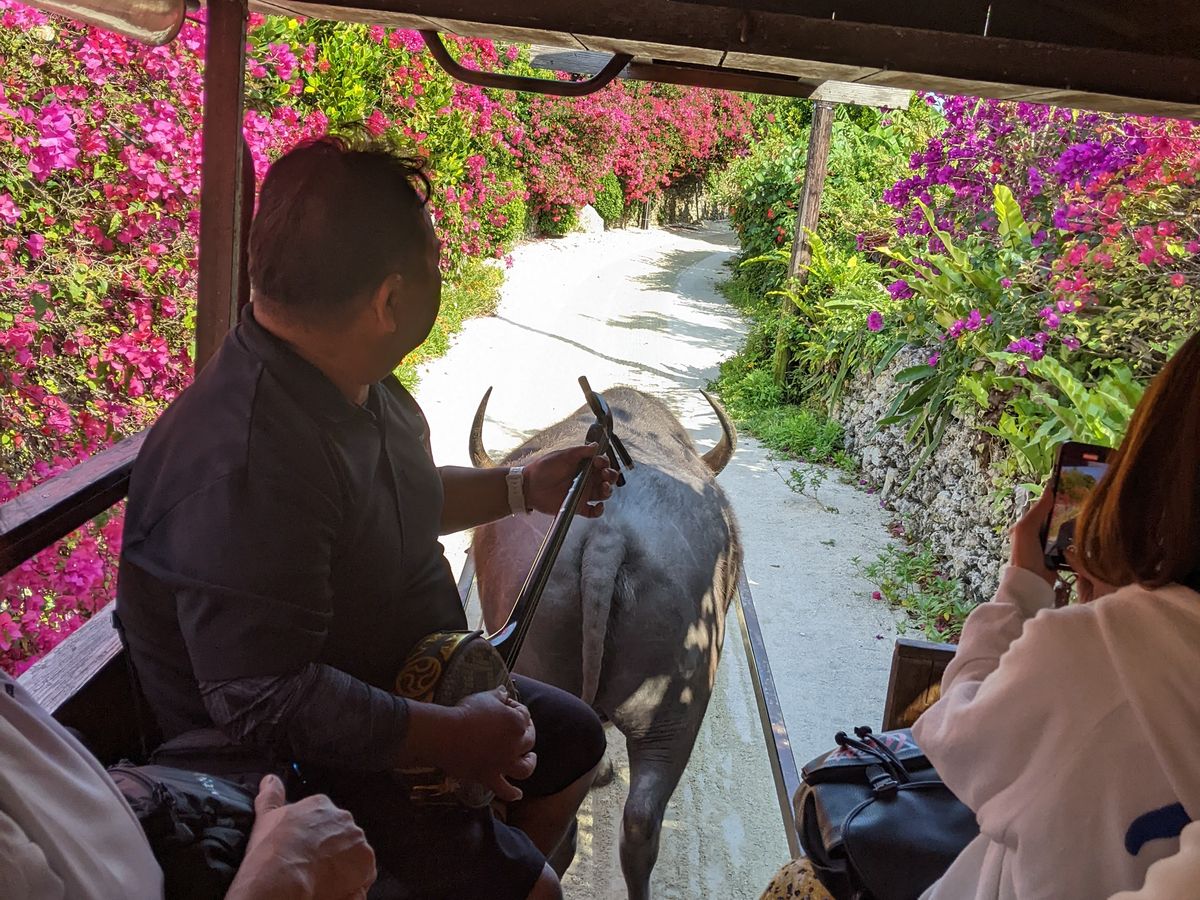 その後竹富島までクルーズし、牛車観光へ。牛車に乗った後はキッチンカーでビールを買って、飲みながら歩いて港へ戻りました。途中ヤギや馬を見たりと、のどかな道を10分くらいかけてビール片手に歩いたのが楽しかったです。