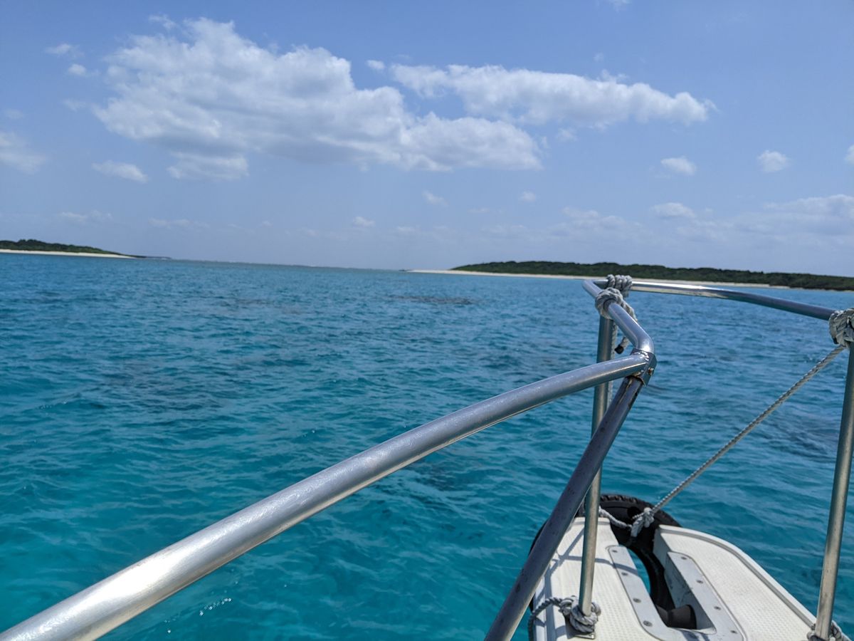 前日海が荒れたため、船着き場に船が停められないようになっていて、泳げなかったのは残念でしたが、クルーザーは貸し切りで、舳先に乗せてもらい、透明な海を眺めることができました。360度見渡す限りの大海原をひとり占めしながら進むのはとても爽快でした。
