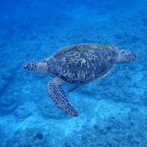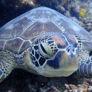 シュノーケリングを始めてすぐにスタッフのお兄さんがウミガメを発見し、みんなで見ていると海面まで上がってきてくれました。