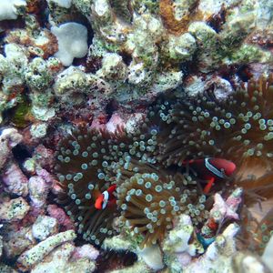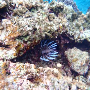 カクレクマノミやミノカサゴなど色々な魚がたくさん見られました。そして、幸運なことに、カメにも遭うことができました!コバンザメが一緒にいて、ちょうど浮き上がってきてくれたので、近くでよく見えました。