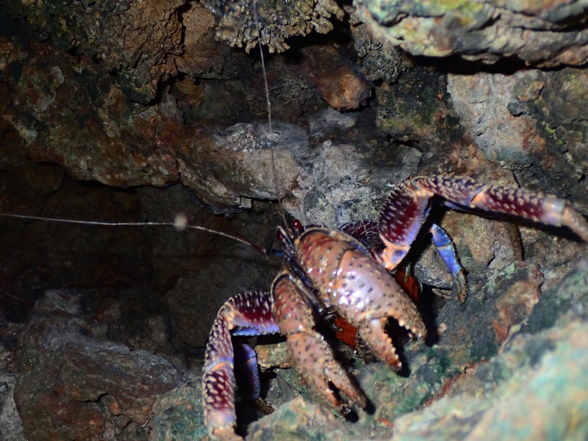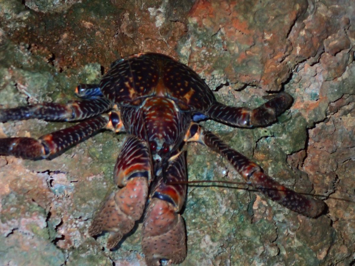 すると、いた!というガイドさんの声に皆で駆け寄ると、岩場の上の方に大きな貝のないヤドカリのような生き物が。ヤシガニです。
