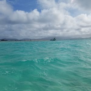 9/24の午前中のツアーには前日鳩間島に渡れないため急遽申し込みした次第です。波が強くなりつつある、風が強くなりつつあるという状況にしては晴天だったので幻の島などは大変綺麗な景色でよかったです。正しい名称は浜島と言うそうです。小浜島と竹富島の間あたりに潮の流れ関係で砂がたまってできるものだそうです。ハワイのカネオヘのサンドバーにはいったことありますが、夜明け前の時間でしたので、青い綺麗なこの幻の島は爽やかでした。
