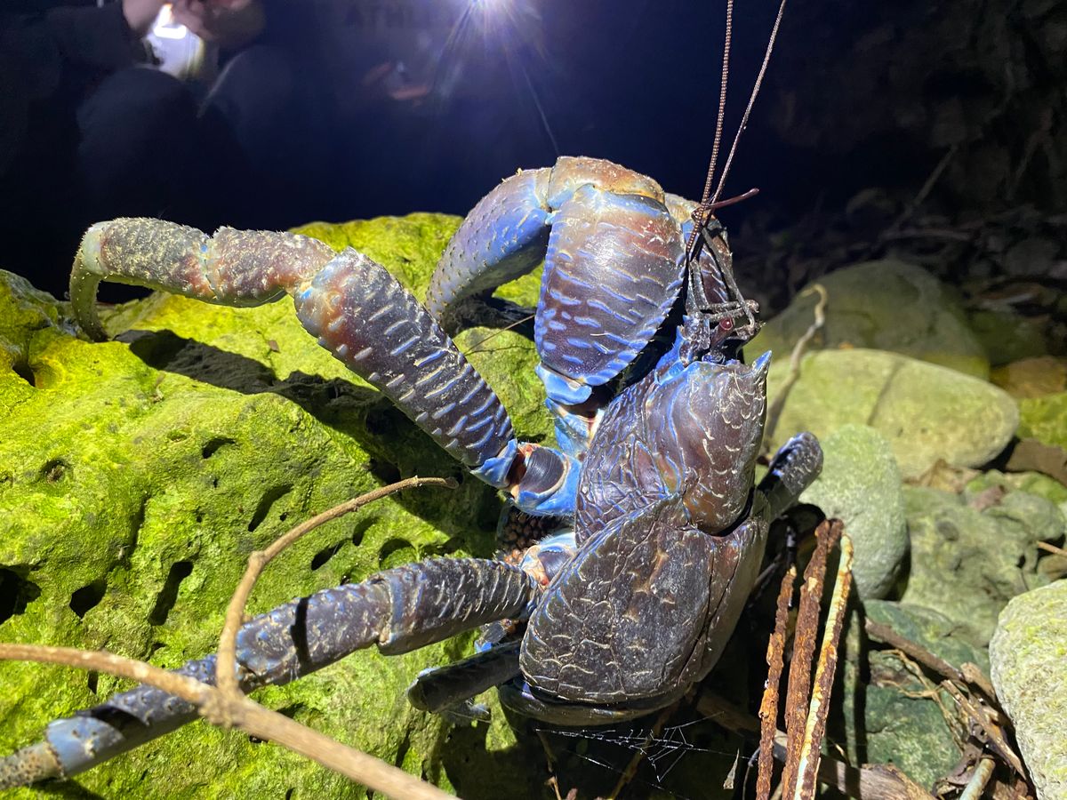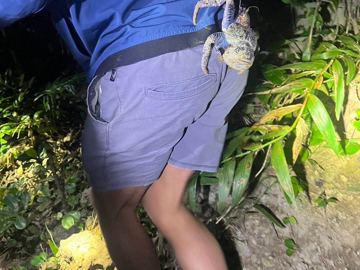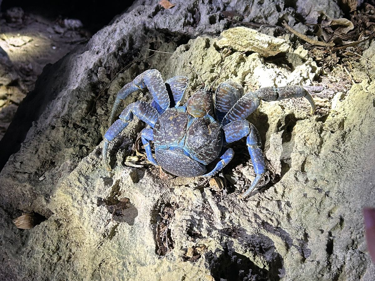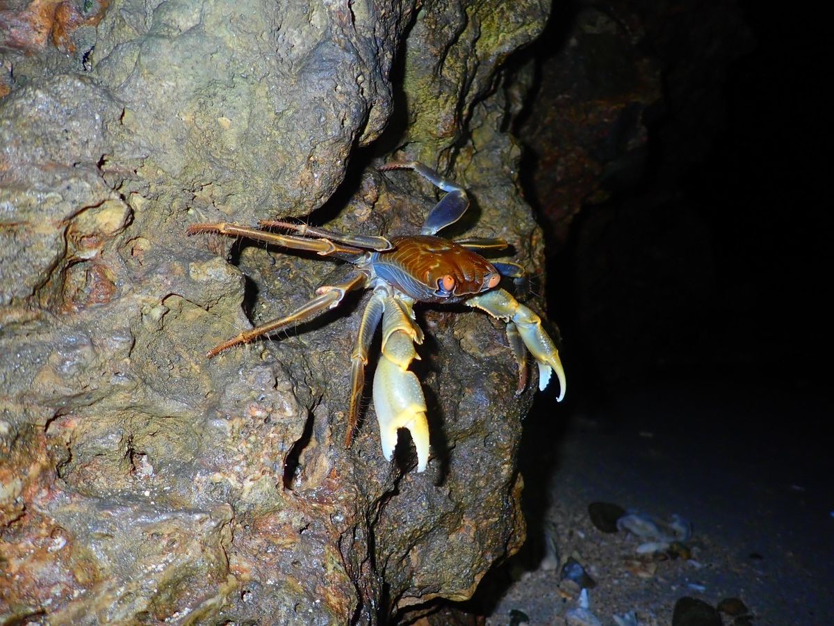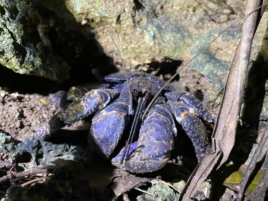 現地は、普通の人は入っていけないような真っ暗な深い森の中を進んでいき、とてもわくわくしました。洞窟や岩場を歩くのも面白かったです。お目当てのヤシガニも3匹ほど見ることができました。他にもカエルや虫を見つけて、昆虫やは虫類が大好きな息子たちは大喜びでした。雨のため星空は見れませんでしたが木がたくさんあるので、小雨も気にならず大満足のツアー内容でした。