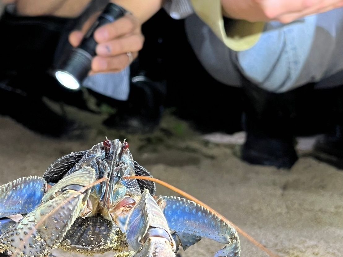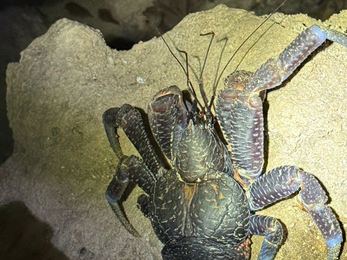 あいにくの曇り空で星は見られませんでしたが、1時間のツアーの中で3匹のヤシガニと拳大のヤドカリ、ウミヘビ、蟹、アシナガグモなどを見られました!