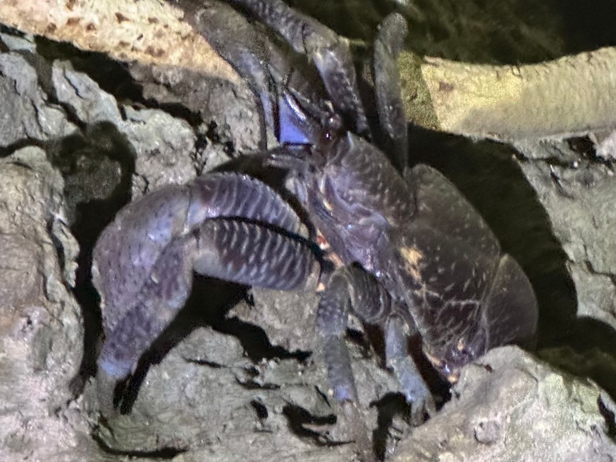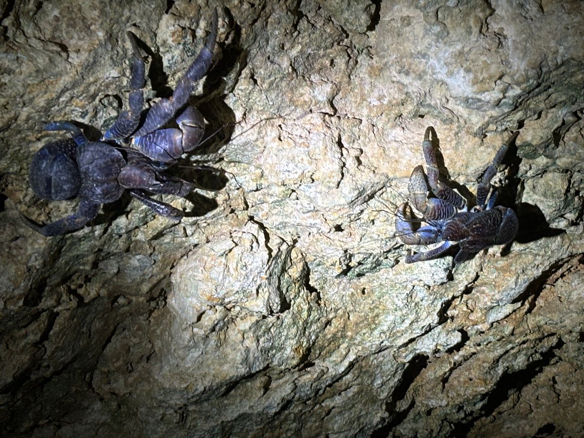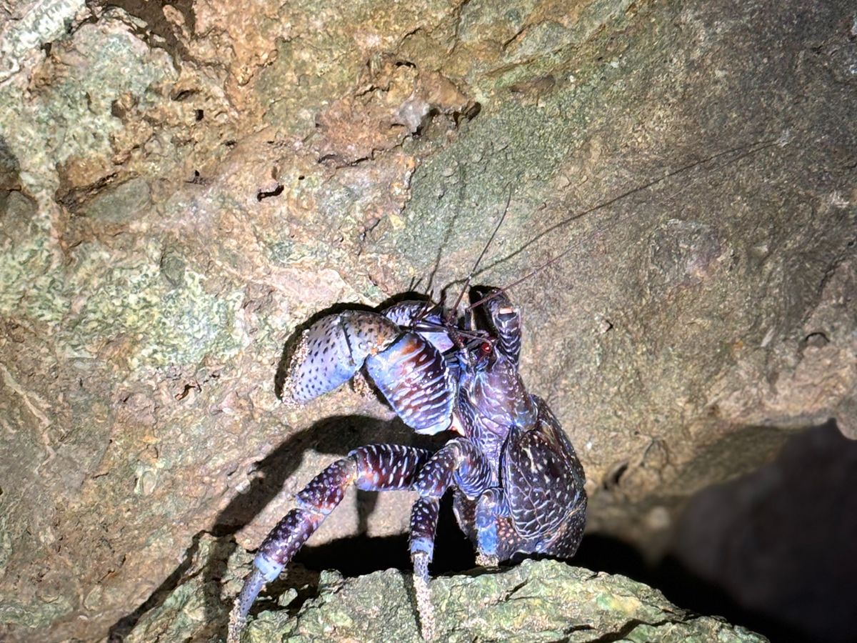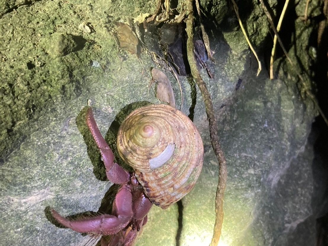 洞窟のヤシガニ、ハブも偶然見れて、蛍、コウモリ、クジャク、天然記念物のヤドカリ?