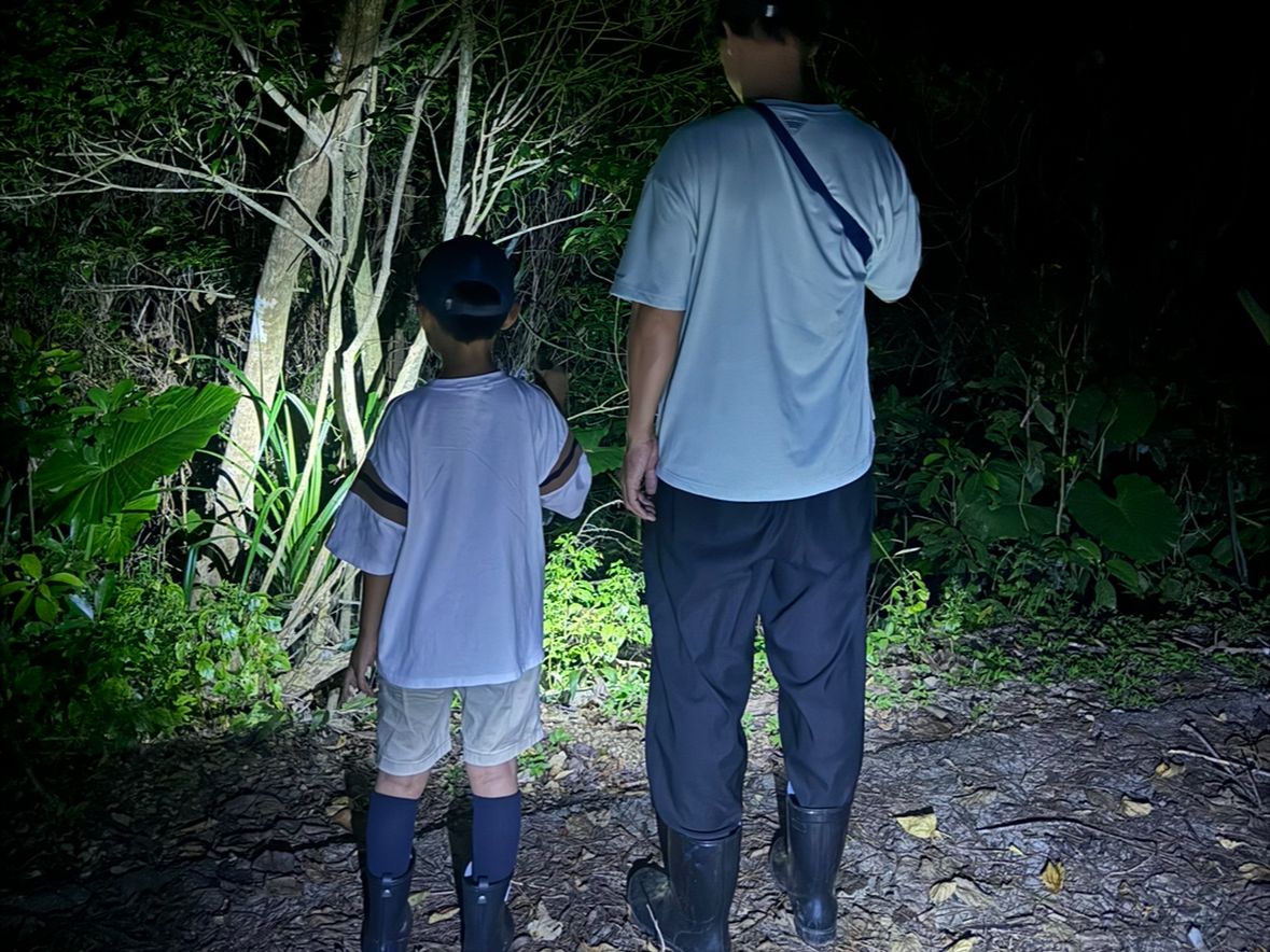 ナイトツアーなのに幼児向けのお化け屋敷すら怖がる子供2人を連れての参加でした。車移動の時からハブや猪が出るかもしれないという説明に子供はドキドキでしたが、現地に着いたら懐中電灯で周辺を照らしながら夢中になって生き物探しをしていました。