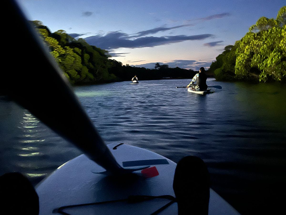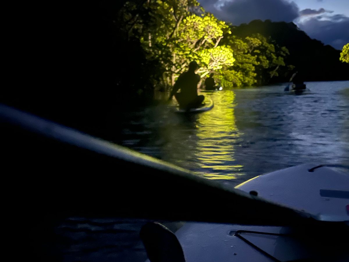 家族でsupを楽しみました。あいにくの雨でした。supのレクチャーを受け、座って漕ぐ から立ち上がって漕ぐ、持ち変えずに両方漕ぐ、回転する といった技まで教えてくれました。全てはマスター出来ず何度か落ちてしまいましたが、凄く楽しかったです。マングローブ探索は真っ暗の中、説明を受けながらゆっくり進んで行きました。大きなコウモリが飛んだりして貴重な体験でした。最後は雨の中でも星 が綺麗に見えました。駐車場が分かりにくいですが、ライフジャケットが干してある所でした。駐車場から川まで、ちょっと距離がありました。着替えの時、シャワーは温水は出ませんが、気温が高かったせいか、あまり気にならなかったです。写真もデータでairdropで送って貰えました。次の日筋肉痛になりました。でも楽しかったです。
