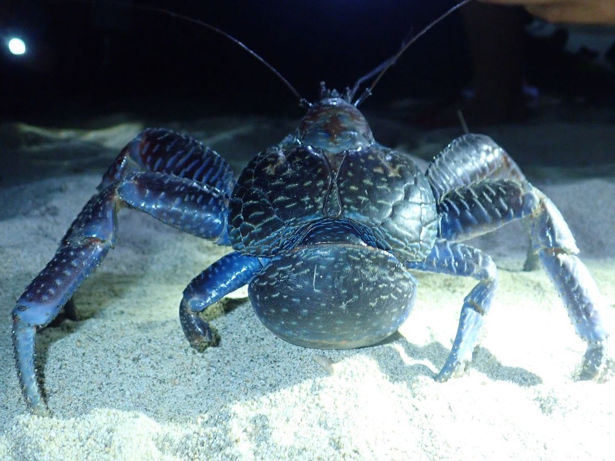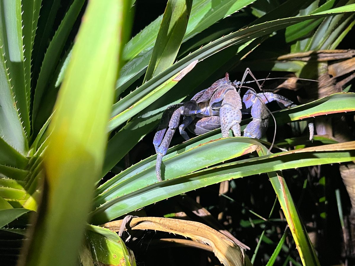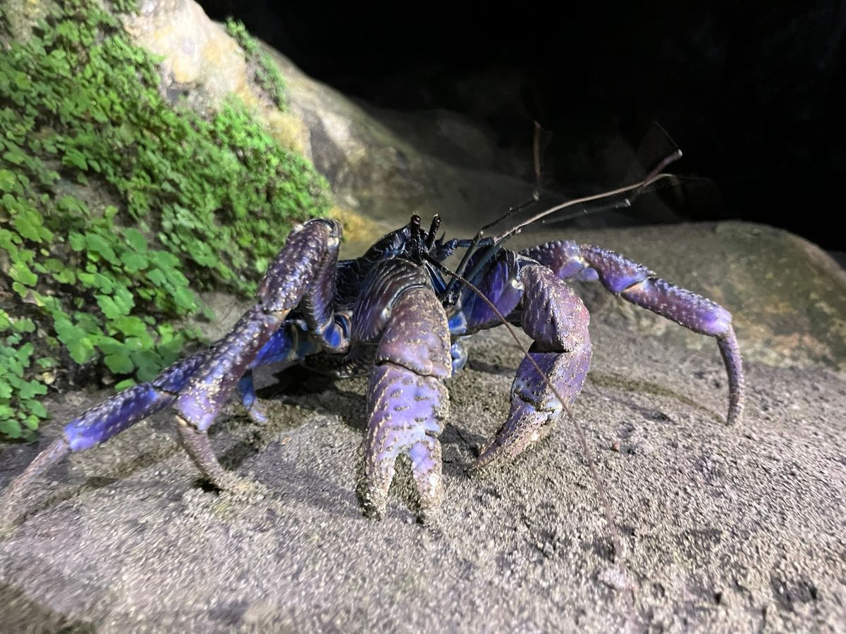 ライトで道を照らしながら坂道をくだっていくと途中でヤシガニと遭遇。鮮やかな青色。今までに見たことがない生物に感動しました。