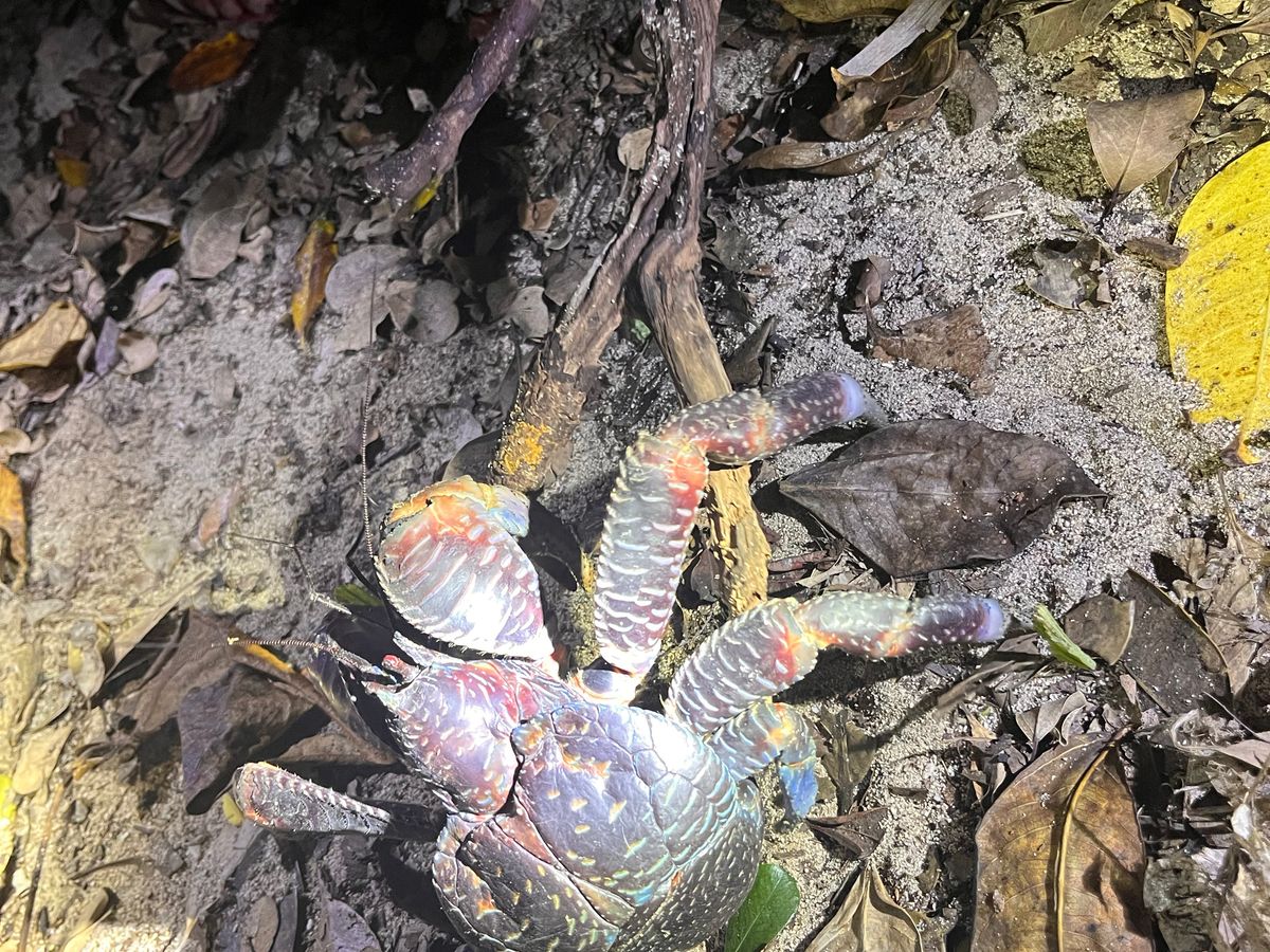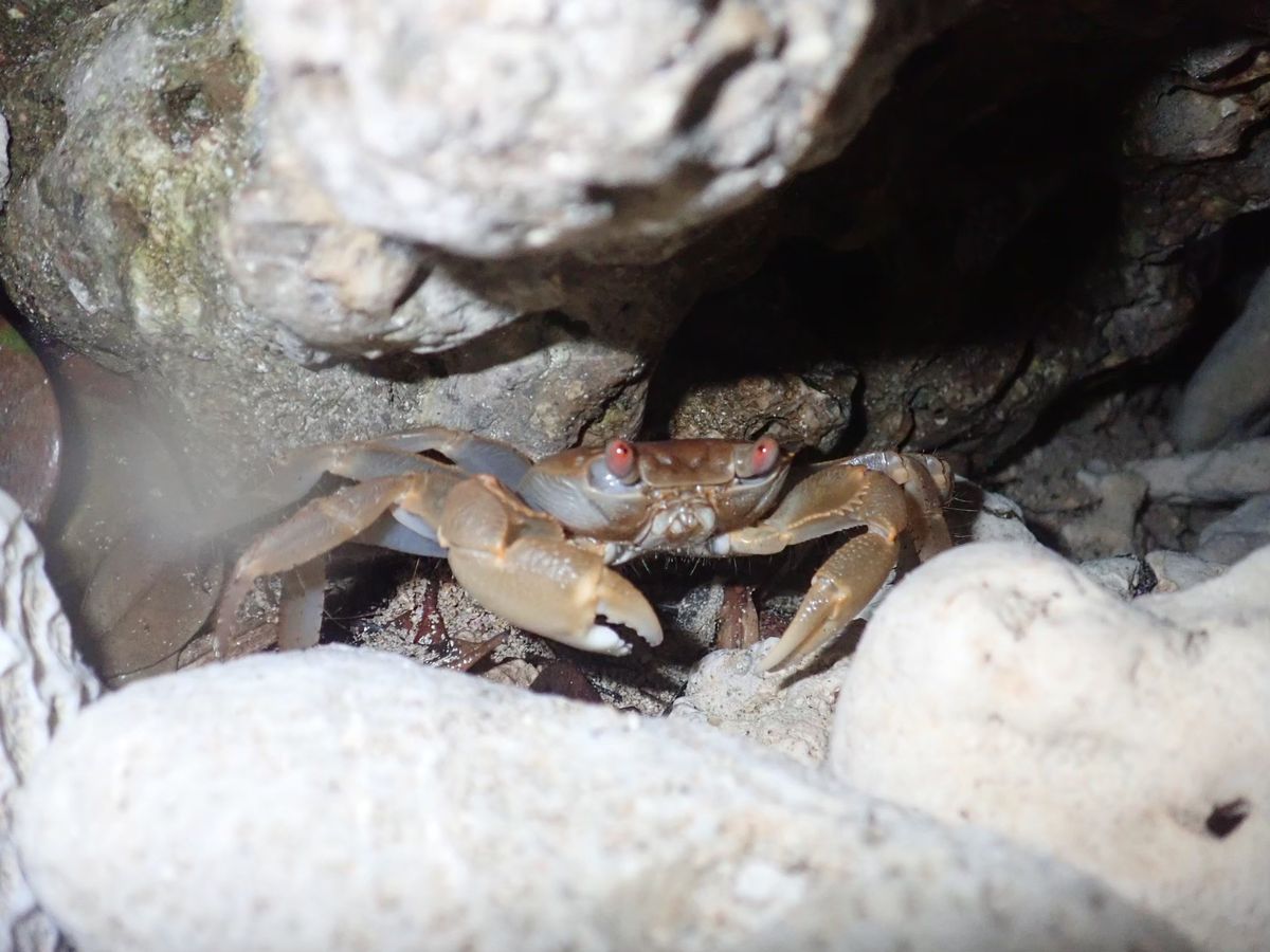 ヤシガニを見てみたく参加しました。3匹見れて、力強く木登りをするヤシガニも見れました。カエルや昆虫なども見れ、子供さんも探すのに夢中になっていました。夜なので足元が心配かもしれませんが、ガイドさんが声かけしてくれ、参加したメンバーで協力しながら探検隊の様な感じで楽しく参加できました。満天の星で感動し、流れ星も見れました。いつ参加してもその時の発見でワクワクできそうです。