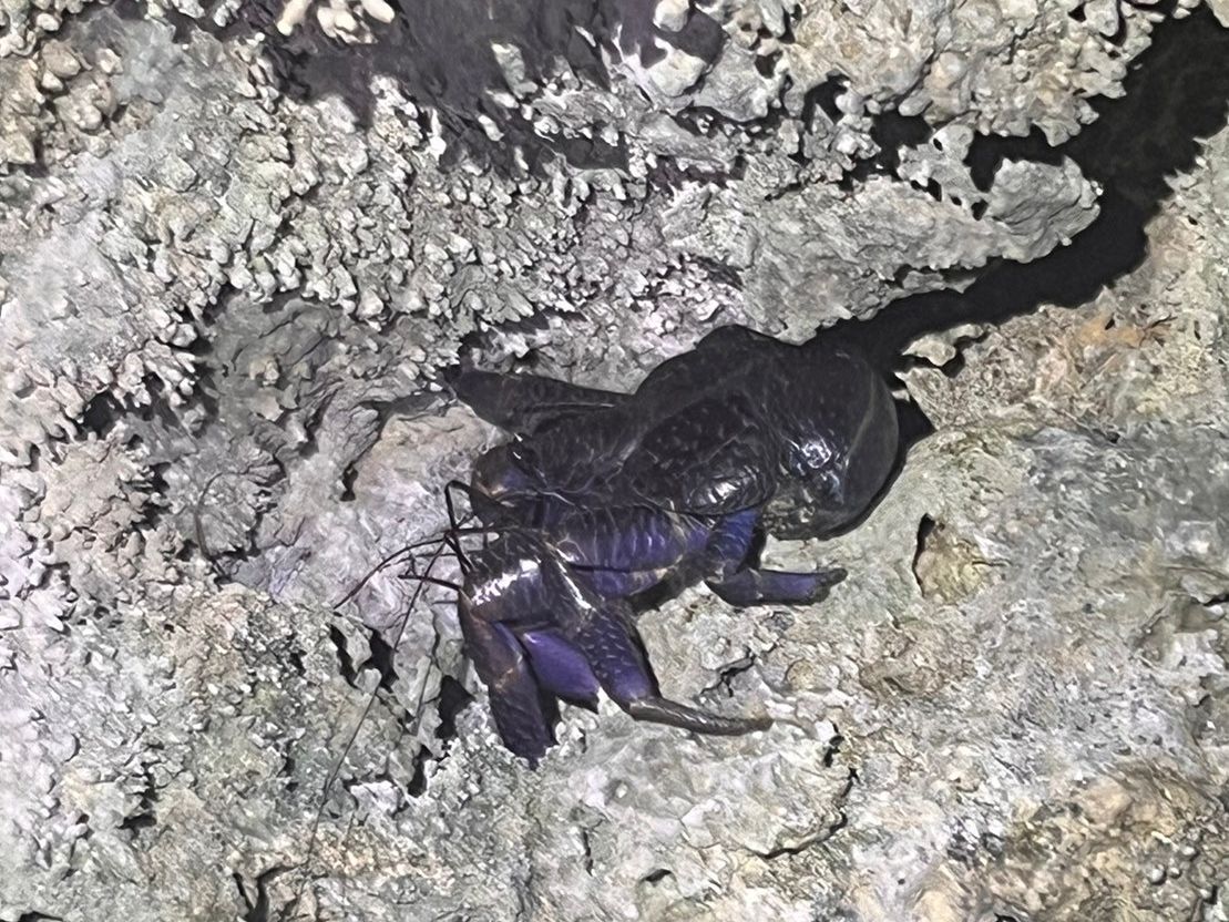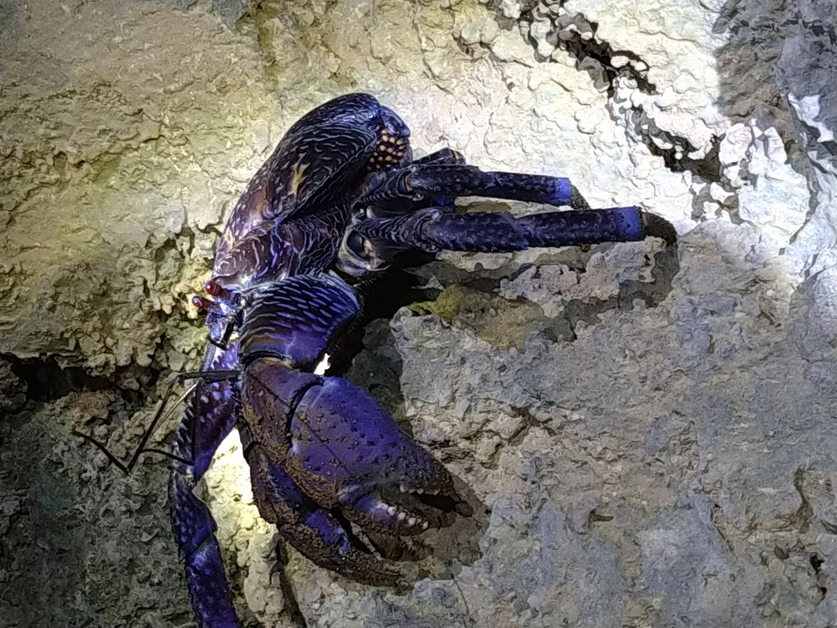 ヤシガニも偶然見つかりラッキーでした。小さいながらもたくましく崖にくっついていました