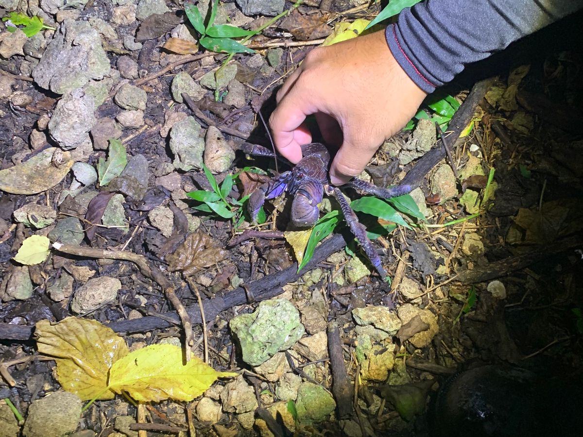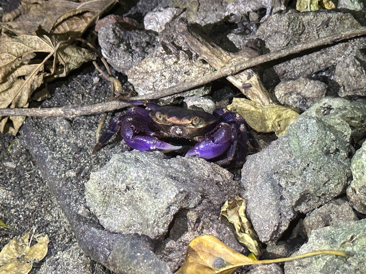 見れた生物、カエル、ゲジゲジ、フクロウ、コウモリ、ヤシガニ、隠れ岩カニ、ホタルの成虫、ヤドカリ、カニ(3種類くらい)