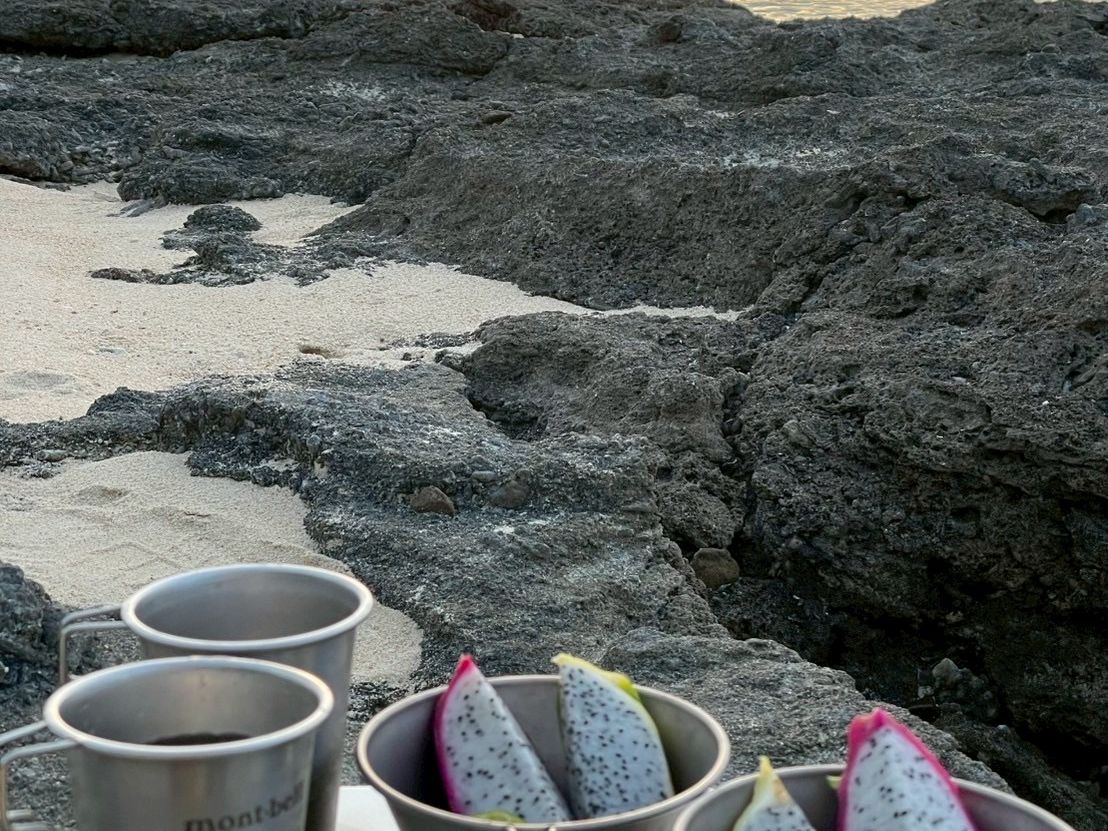 ビーチでは30分ほど休憩を取り、さんぴん茶とドラゴンフルーツを2種類提供いただきました。