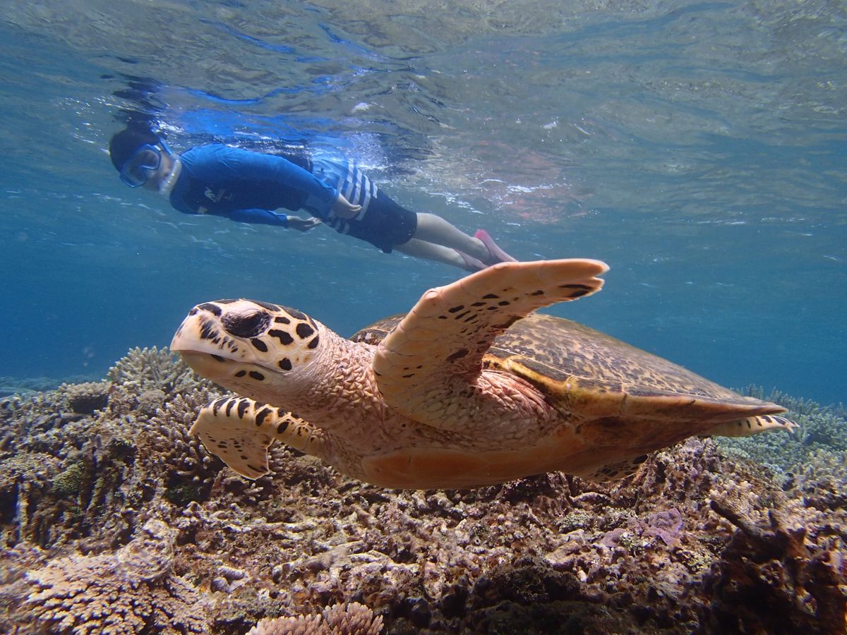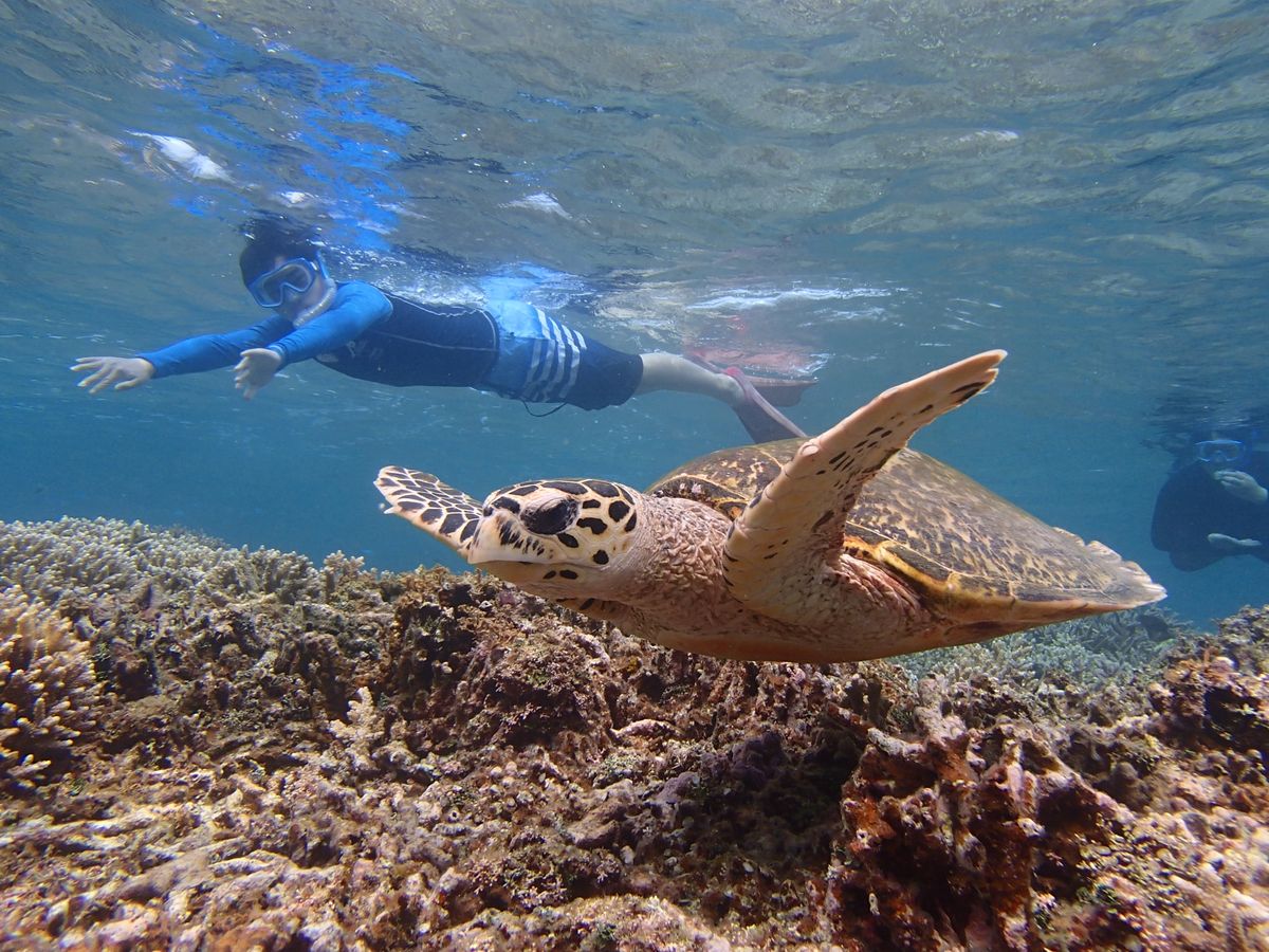 カクレクマノミや熱帯魚の群れ、きれいなサンゴ礁に目を奪われていると、なんと、ウミガメに遭遇!
