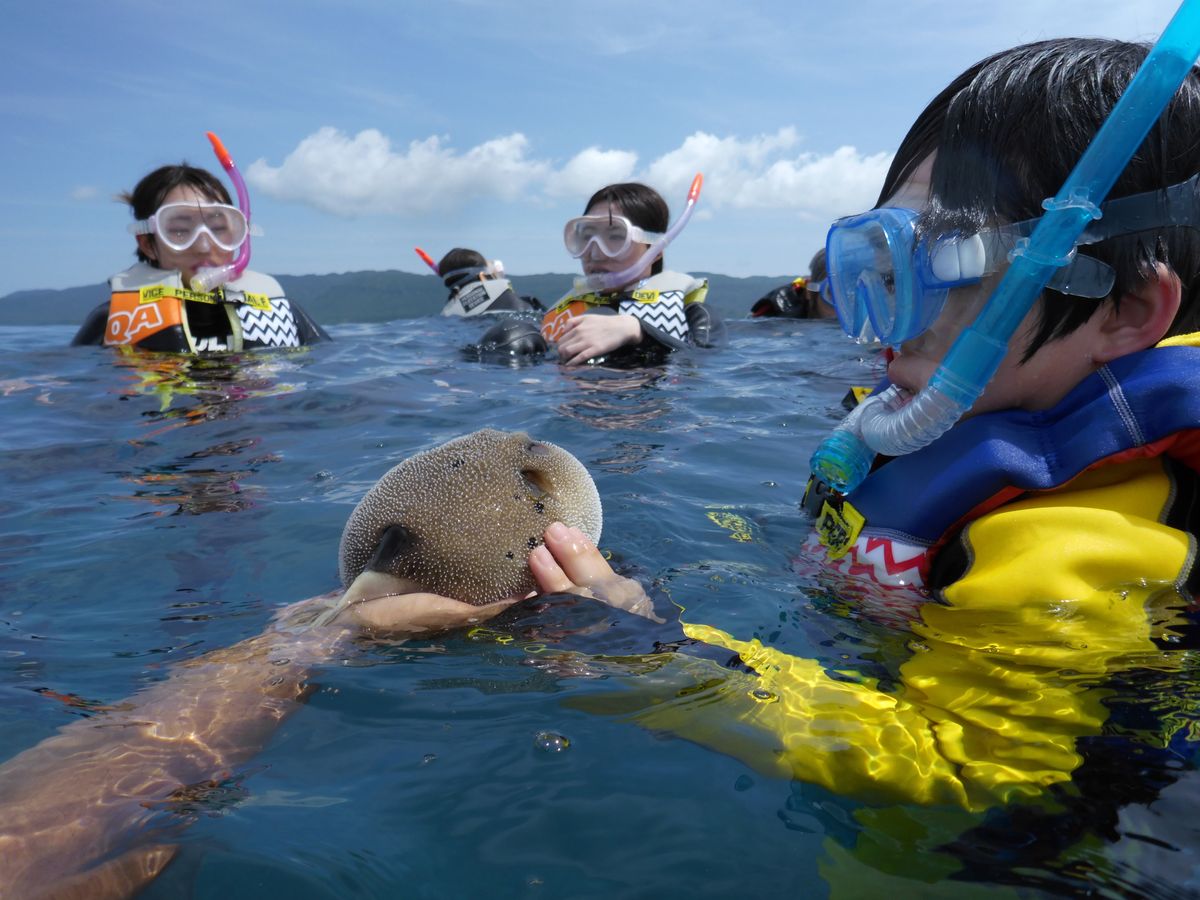 ここではウミガメに遭遇できなかったけど、船長はフグを捕まえて触らしてくれたり