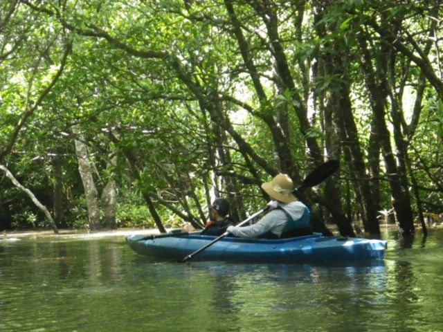午後はマングローブカヤック。2人乗りカヤックで出発です。マングローブが両側に続く静かな川を滑るように進みます。