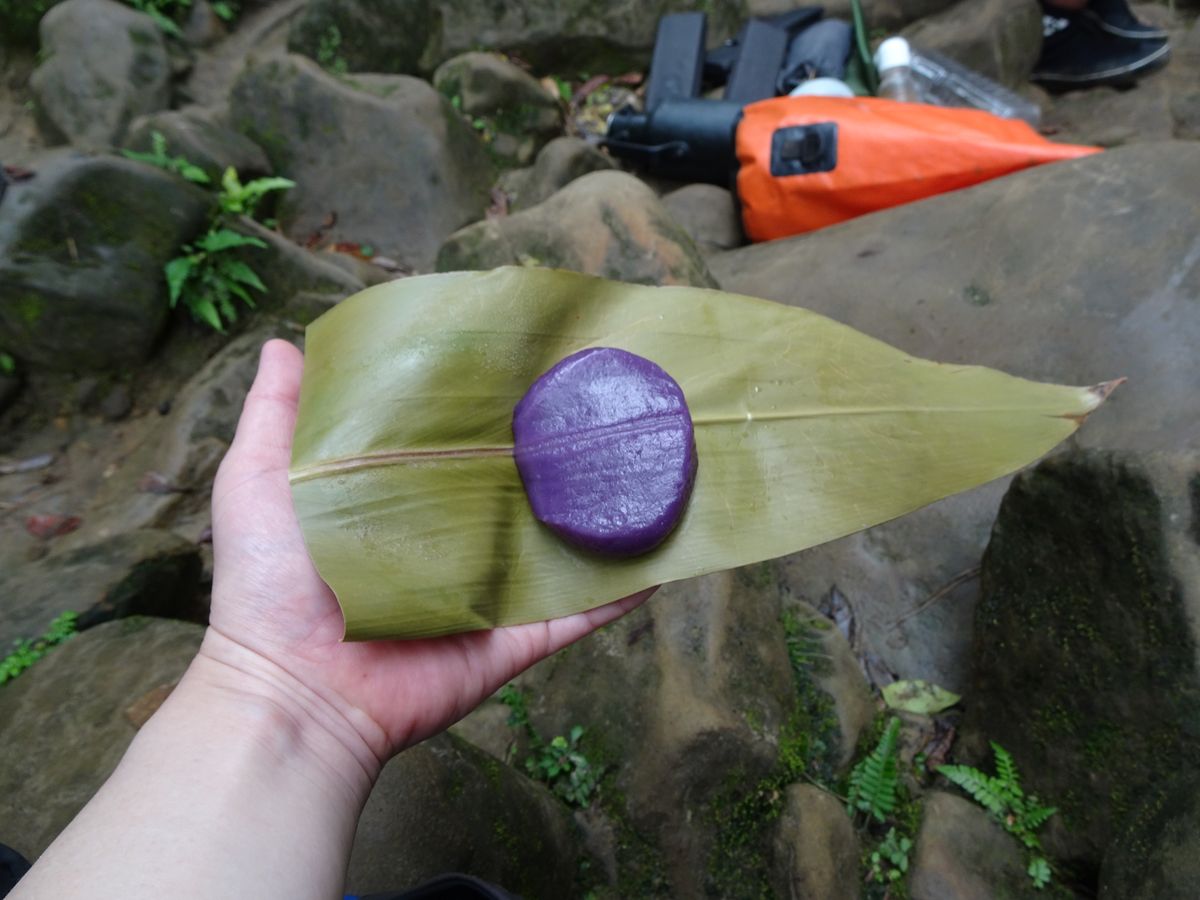 そして、お昼休憩を終えトレッキングで大汗をかいた後の滝壺での遊泳は最高に気持ちのいいものでした。その後いただいたおやつの手作り「ムーチー」が美味しかったです。