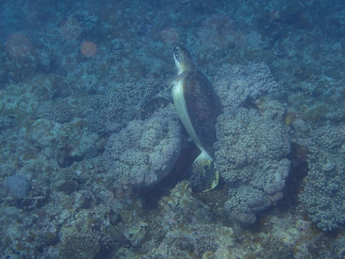 他の所を探しに行きましょうと次のポイントへ、まさに天然の水族館、夢見心地の所に夢??まさか??とわからなくなるくらい、かなり動揺したのを覚えてます。ウミガメが自分の前を泳いでるんです!息継ぎのために海面に上がったり、またスイスイ泳いだり!必死に追いかける私。
