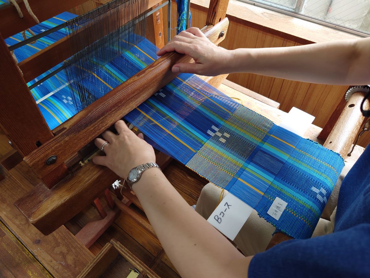 「鶴の恩返し」を子どもの頃読んで以来、一度やってみたかった機織りを体験できると知り、すぐ申し込みました。予め縦糸を通してあるところに横糸を入れていく作業で、少々腰が痛くなったもののとても楽しく、あっという間に出来上がりました。スタッフの方の話を伺って、実は縦糸の準備がものすごく大変だということがわかりました。仕上げをしてもらったものが後日届き、毎日見るたびに石垣島の海の色を思い出しています。