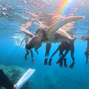 前夜豪雨、当日朝も曇り空で心配しましたが、予定通りに体験することができました。気さくな担当のお兄さんが丁寧に説明してくださりました。初めてのシュノーケリングと思ったよりしっかり泳いでいくことに少しドキドキしましたが、無事にウミガメさんと出会うことができ、2匹のウミガメが近くで泳いでいる姿や、また少し離れたところでも出会うことができ嬉しかったです!岸の近くはやや濁っていましたが、ウミガメのあたりの海は綺麗で珊瑚礁もよく見えました!