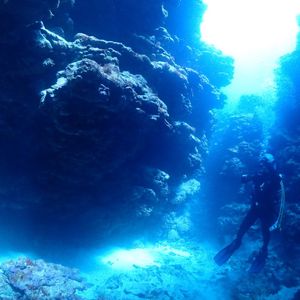 体験ダイビングでは、シュノーケリングよりも深い所で長時間海中を潜水することができ、ライセンス要らずでインストラクターがていねいに指導しますので、初心者でも安心して楽しめます。青一色の世界と、見上げれば光のカーテンが揺らめいています。海底には岩場やサンゴがあり、数え切れないほどたくさんの小さな魚たちが隣をすり抜けていく体験はダイビングならでは。世界屈指の沖縄の美しい海、青の洞窟、ジンベエザメなどの魅力的な体験ダイビングに出掛けましょう!