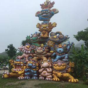 クラブハウスまで戻る途中ユニークで極彩色の巨大シーサーの森を案内してもらい、荒川の滝で滝遊びをしました。波が荒く人気が少ない川平湾はそれでも美しく、プライベートビーチ感覚で見ることができました。