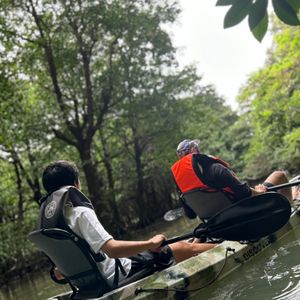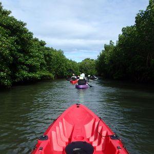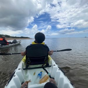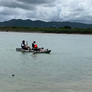 海といえど河口付近なので、掲載されている写真のように青く澄んだ海の色ではありませんが、私たち以外誰もいない海をのんびりカヤックで漕ぐことができ、貸し切り気分になれてお勧めです。他のカヤックツアーの方々にも川の途中で合流しましたが、おおよそ川の途中から漕ぐコースのようでした。こちらのコースは海から川の上流へ向かい、また海に戻ってくるという往復コースでした。