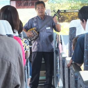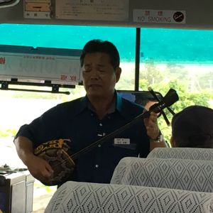 車内では名物ガイドのおじさんが三線と歌を聞かせてくれます。