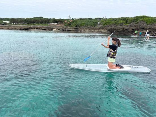 SUPを漕ぎながら魚やサンゴを見てみよう!宮古島の透明度抜群の海はまるで浮いているようにも見えます。ぜひ写真も撮ってお楽しみください。天候次第ではドローンで撮影した動画をプレゼントいたします♪
