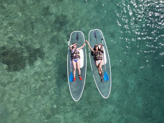クリアSUPツアー 透明度抜群の宮古島の海で非日常体験♪透明ボートで海の中や周りの景色を贅沢に楽しむ ドローン撮影でSNS映え<1時間/宮古島>