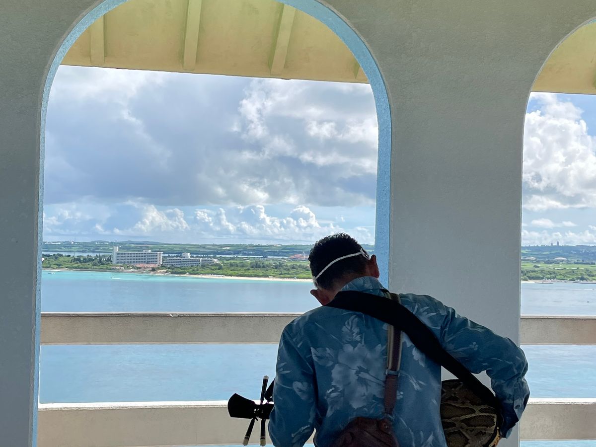 ホラガイや、三線をひいてくださったり、リクエストも募ってくださいました。三線の蛇の皮を触らせてくださり貴重な経験をしました。