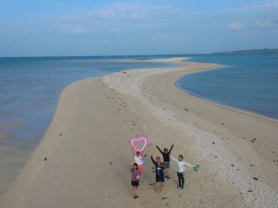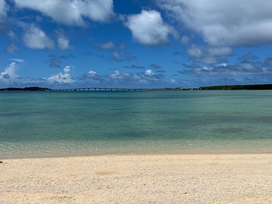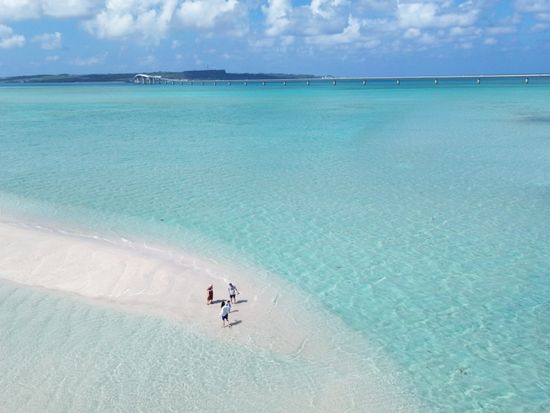快晴の中、ボートで伊良部大橋をくぐり、たどり着いたユニの浜
