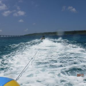 彼女と2人で行きました。僕たちはAコースだったのですが、一日中遊び放題ということにとても驚きました。一日中といっても、お昼ご飯を食べなくちゃだから、12時ごろには帰ろうなんて考えていたら、な、なんとこのコースはお昼もついていたのです!アンビリバボーです!お昼はカレー、宮古そば、やきそばの3品から選べて、とてもおいしかったです。肝心なマリンスポーツはというと、バナナボート等のボートを4種類くらい乗ったり、ウェイクボードになったりしました。でもここで紹介したいのは、なんといってもジェットスキーで運んでもらった先でのシュノーケリングでしょう!元気いっぱいの魚たちがサンゴ礁の周りをゆうゆうと泳いでいました。インストラクターさんからもらったえさをあげて、魚たちと触れ合い大満足でした。このコースは大人気らしく、人がたくさんいる一方、ジェットスキーが2台しかなく、待ち時間があることがほんの少し残念でしたが、それ以外は文句なしでした。みなさんも宮古島に来た際にはぜひ!おすすめです!