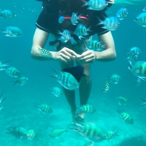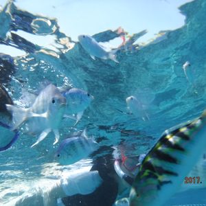 シュノーケルでは友達が先に上がったので、私1人の周りにエサを撒いてくだり、おかげで海の中で魚まみれになれました。