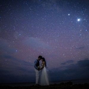 周りに街灯などない浜辺での撮影なので、星が空一面に広がる中撮影して貰いました!