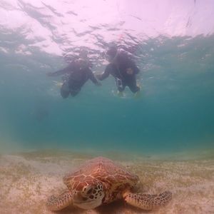 60代の夫婦で参加。いろいろツアーを探した中で、こちらは99%の遭遇率、しかも65歳未満まで参加ok!です。(素敵!)ツアーは、体操から始まり、自分の命を守る為に気をつけること、宮古島の自然を守る為に大切なことをレクチャーしていただきました。スタッフの方は、さりげなく目配りしてまめに声をかけてくださったり、ツアー参加者に体調不良者が出た時には、優しくまたツアーに支障が出ないように臨機応変に対応されたりする姿に、安心して参加できるツアーだと思いました。ツアースタッフの山ちゃんは、海亀に会えるポイントを知り尽くしてます。山ちゃんのおかげで、数カ所で海亀やたくさんの魚に会えました!さすが海亀博士です!また海に潜って良いショットの写真もたくさん撮ってくれました。プロのカメラマン?だったのかな??個人では難しいことをたくさん経験できる大満足なツアーでした。山ちゃん、スタッフの皆さんありがとうございました。