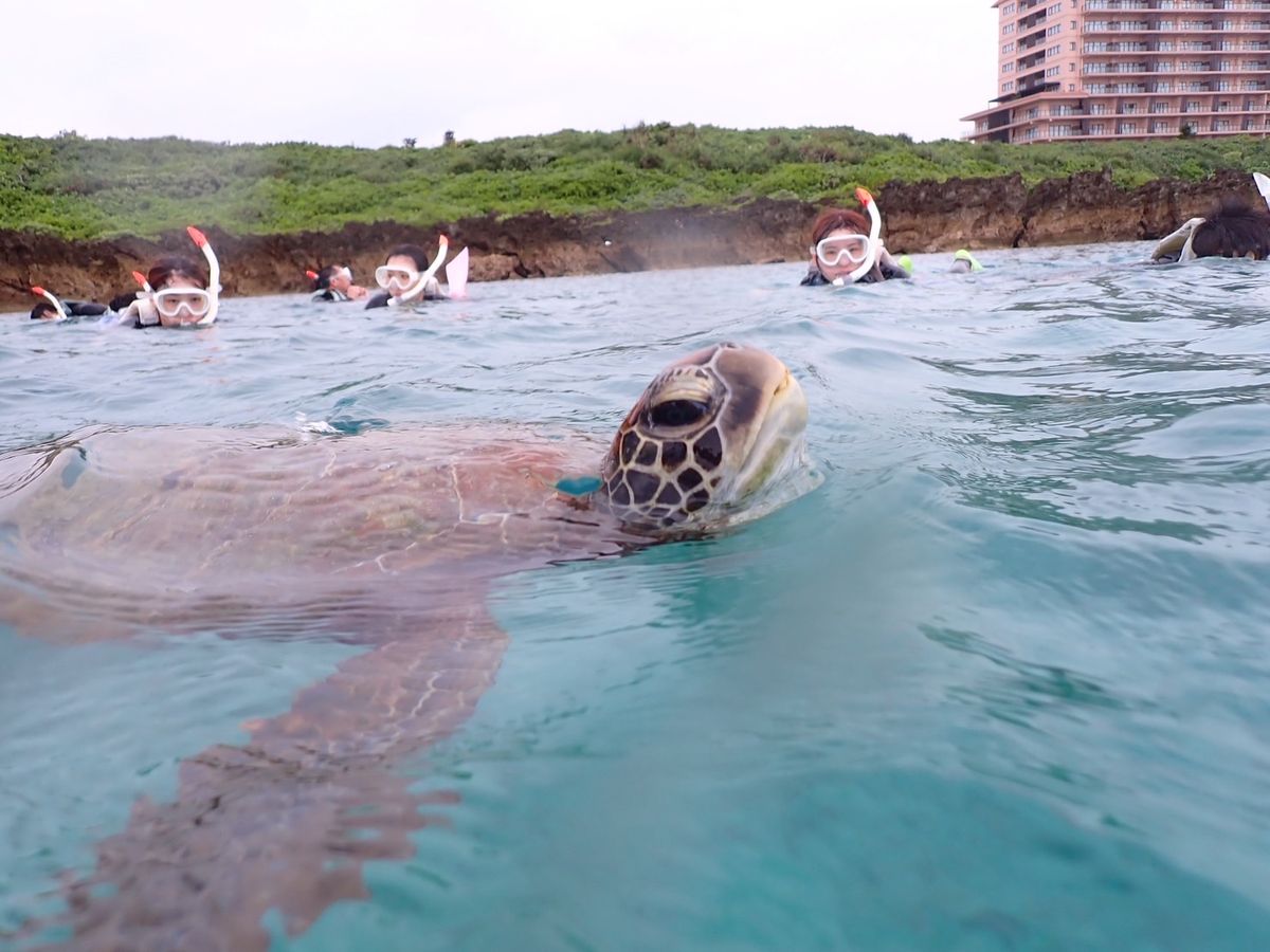 午後はウミガメを見るシュノーケリングツアーに参加しました。水は少し冷たかったですが、だんだん慣れてきて、泳ぐのが少し不安でもガイドのマユちゃんが浮き輪を持ってリードしてくれるので、安心して参加することが出来ました。