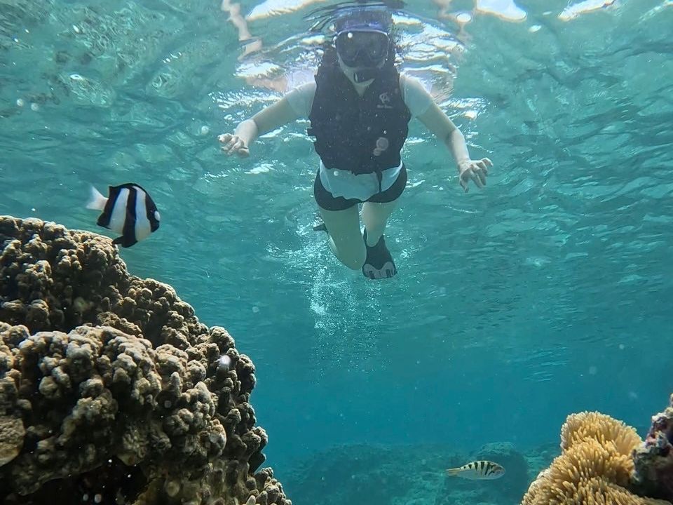 シュノーケリングでは、思ったより水深のある場所まで行き、きれいなサンゴ礁や魚たちを見られたので満足感がすごくありました。