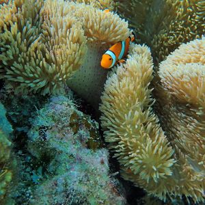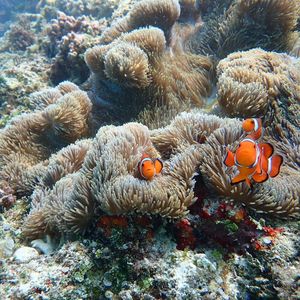 イソギンチャクの中にいるカクレクマノミを発見、間近で可愛い姿に見入った後、ウミガメを探しに向かう