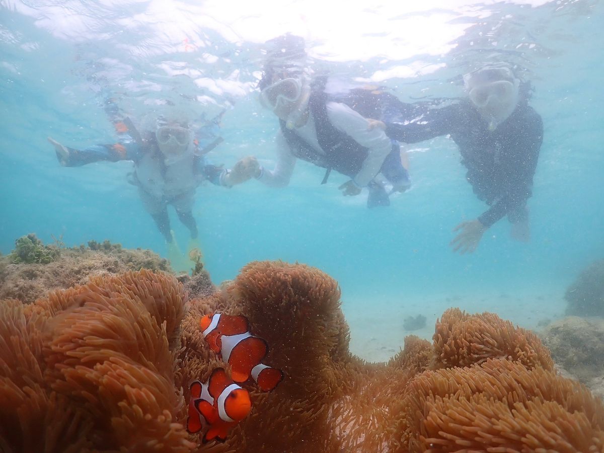 浅瀬でアオウミガメがすぐにいて、ツアー中に3匹ぐらい見られました、目が大きくて、可愛かったです。イソギンチャクとクマノミも見らました、すごい不思議な光景で、これは一見の価値ありてす。水中写真も撮って頂きました。