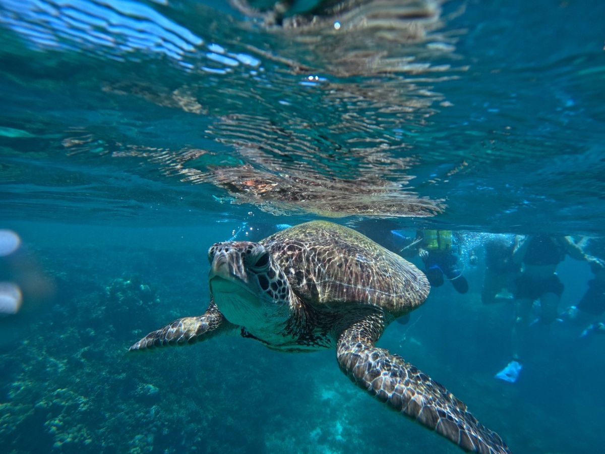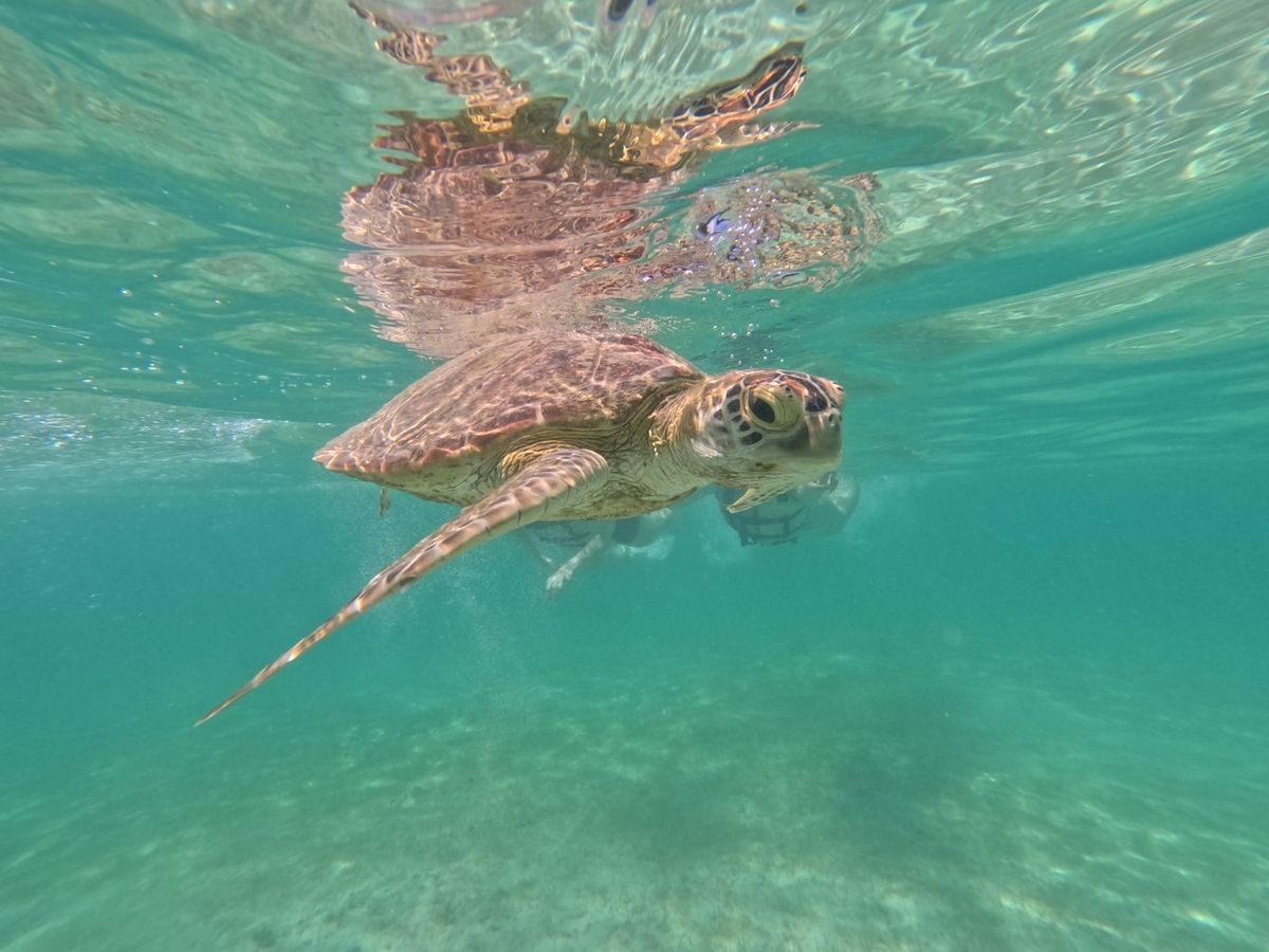 はじめにシュノーケリングの説明を受けて、すぐに海の中へ!7月の平日15時頃であったので人も少なく快適でした。しばらくもぐっているとガイドさんがウミガメを見つけてくださり、そのポイントに誘導してくれました。3匹のウミガメに会うことができ、ガイドのるいさんともえかさんのお話もとてもタメになることも多く楽しかったです!写真もいっぱい撮ってくださって大満足でした!