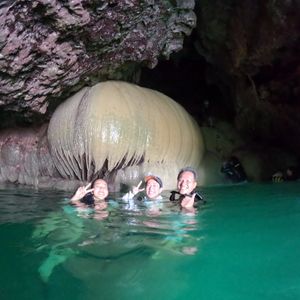 びっくりするほど透明な海をシーカヤックで鍾乳洞へ向かい、小さな入り口を潜ると神秘的で不思議な鍾乳洞の中。