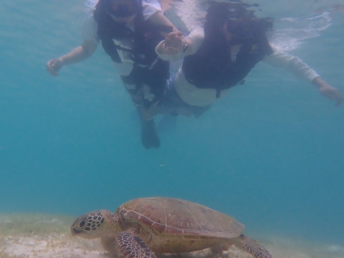 今回の目的だったウミガメと一緒に写真を撮ってもらえてとても満足しています。小さな魚たちも色とりどりで水も透明で水槽の中で泳いでる気分になりました。なかなか自分たちでは撮りにくい綺麗な水中写真を撮ってもらいたい方におすすめのアクティビティです。