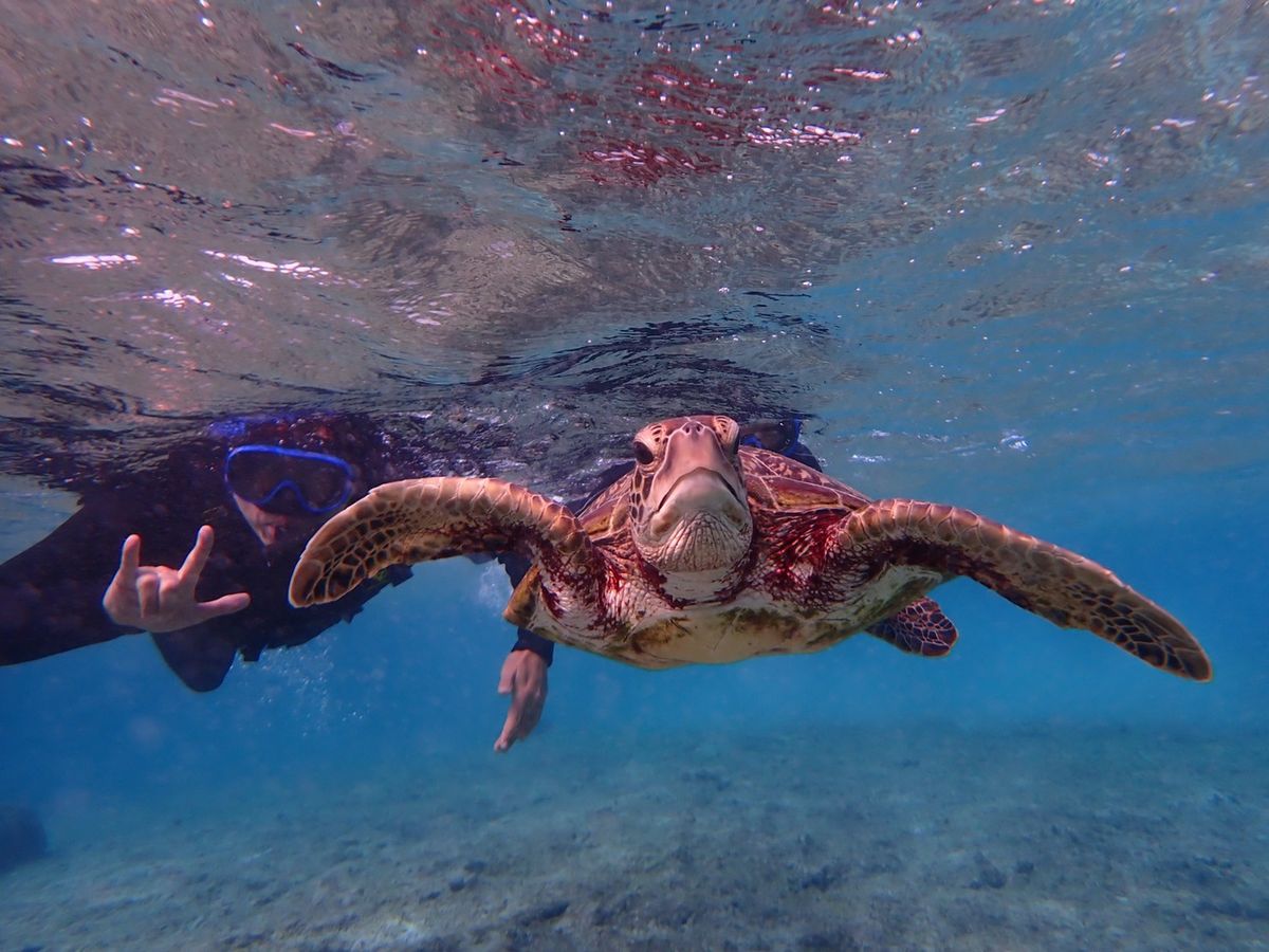 午前中のシュノーケリングではウミガメに会えました。想像以上に近くで見られて、写真も撮っていただきよかったです。