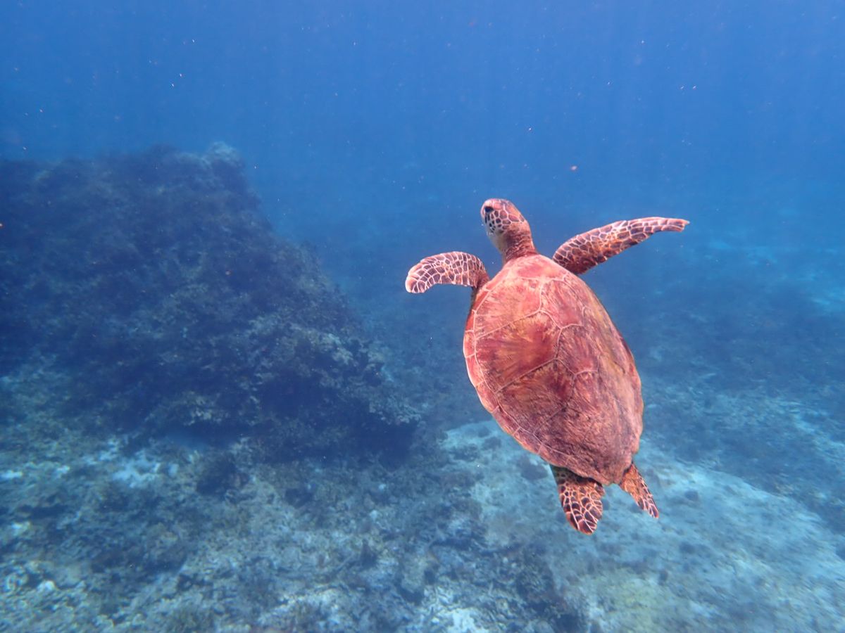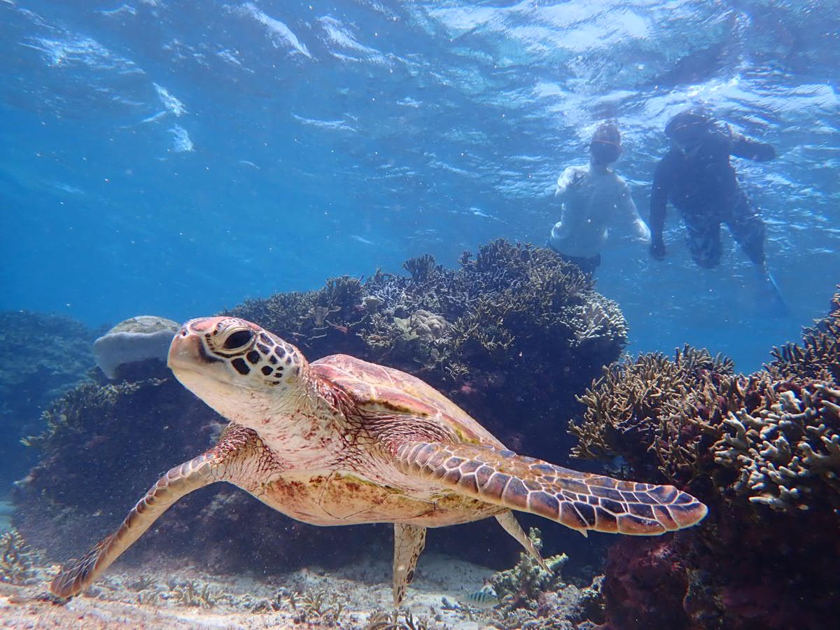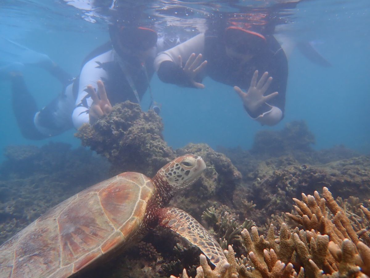 次のシュノーケリングでは、ゆっくり泳ぐウミガメと写真を撮れましたし、クマノミの紹介やサンゴ礁付近にも行けたので良かったです!