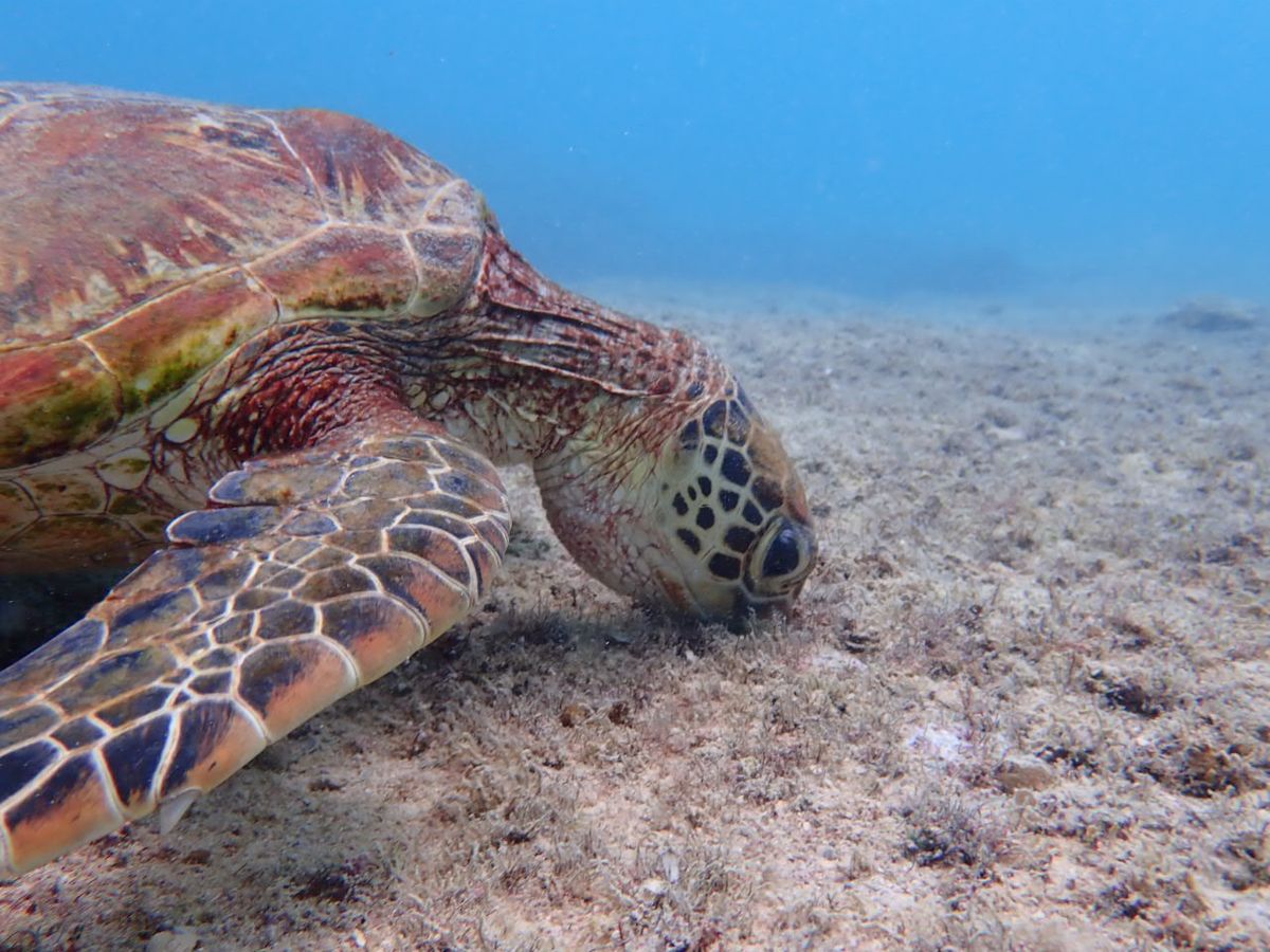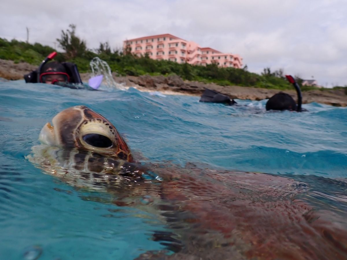 ビーチに入ってから10分もしない場所で、アオウミガメに遭遇しました。シギラビーチの目の前です。