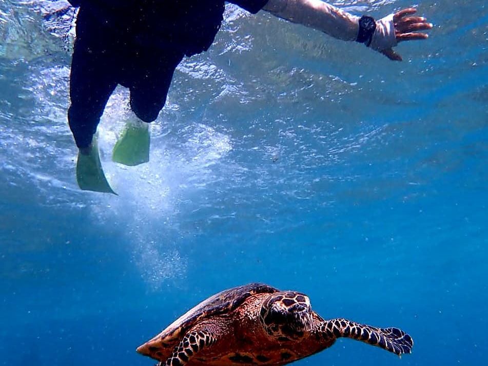 当日は、少し天候が悪く、最初のビーチは波があったので2か所目の場所に行きシュノーケリングしました。すぐに亀と遭遇して、ずっとそばで泳いでいました。魚もたくさんいて、ガイドさんの説明もわかりやすくて、とてもおすすめです。