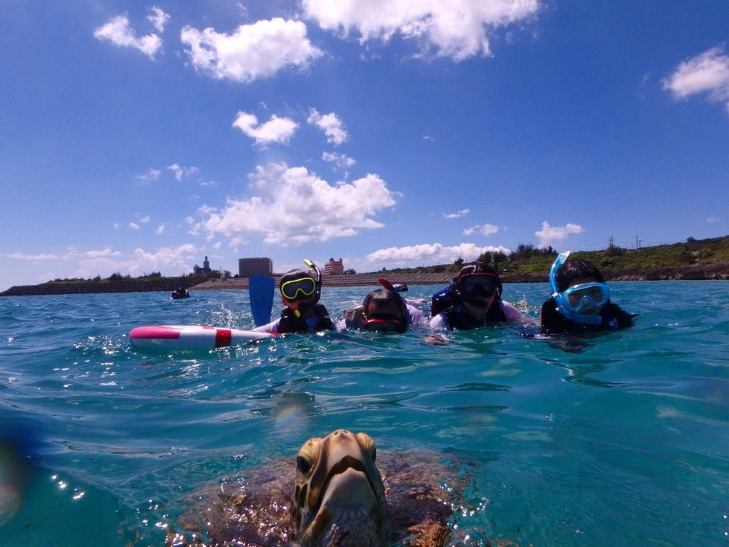 シュノーケルは遊び程度しか経験がなく、子供より私が不安でしたが、最初に教えてもらい、ゆっくりスタートしてもらったので、落ち着いて泳ぐことができました。シュノーケルに慣れながら泳いでいくと、ウミガメを発見!思っていたより小さかったので、子ガメです。海藻を食べていました。カメの食事を観察しながら、息継ぎの為、水面に浮上してくるのを見守りながら、待ちました。そして浮上してきた可愛いウミガメと写真パシャリ!目の前で泳ぐ姿がとても可愛いかったです。