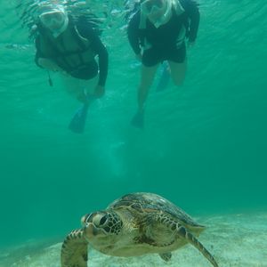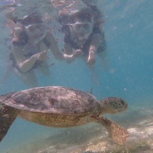 妻と二人での参加でした。泳げない妻でしたが、ガイドさんの浮き輪につかまりながら安心して楽しめました。透明度の高い海でゆったりとシュノーケリングをしていると目の前にウミガメが現れました。海藻を食べながらゆっくりを泳いでおり、長い時間ウミガメを見ていることができました。