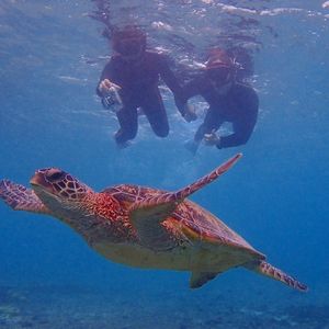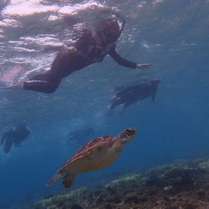 同行者は泳ぎが得意ではなく、シュノーケリングも初体験でしたが、丁寧に教えて頂けたので、すぐに水深2.5mほどの地点まで泳いでいってウミガメと一緒に写真をとることができました。透明度の高い海で、たくさんのウミガメと泳ぐことができて感動。少人数だったのも良かったです。